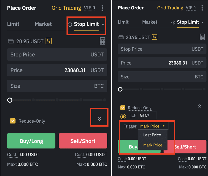 - 스탑 가격은 기본적으로 “마크 가격(Mark Price)”으로 설정되어 있습니다. “최종 체결 가격(Last Price)” 또는 “마크 가격” 중에서 선택할 수 있습니다.