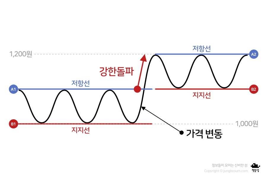 - 지지선은 가격이 더 이상 내려가지 않고 계속 반등하는 구간입니다.